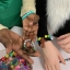 A selection of wooden or plastic beads, bracelet elastic or cord, scissors, small wooden crosses.